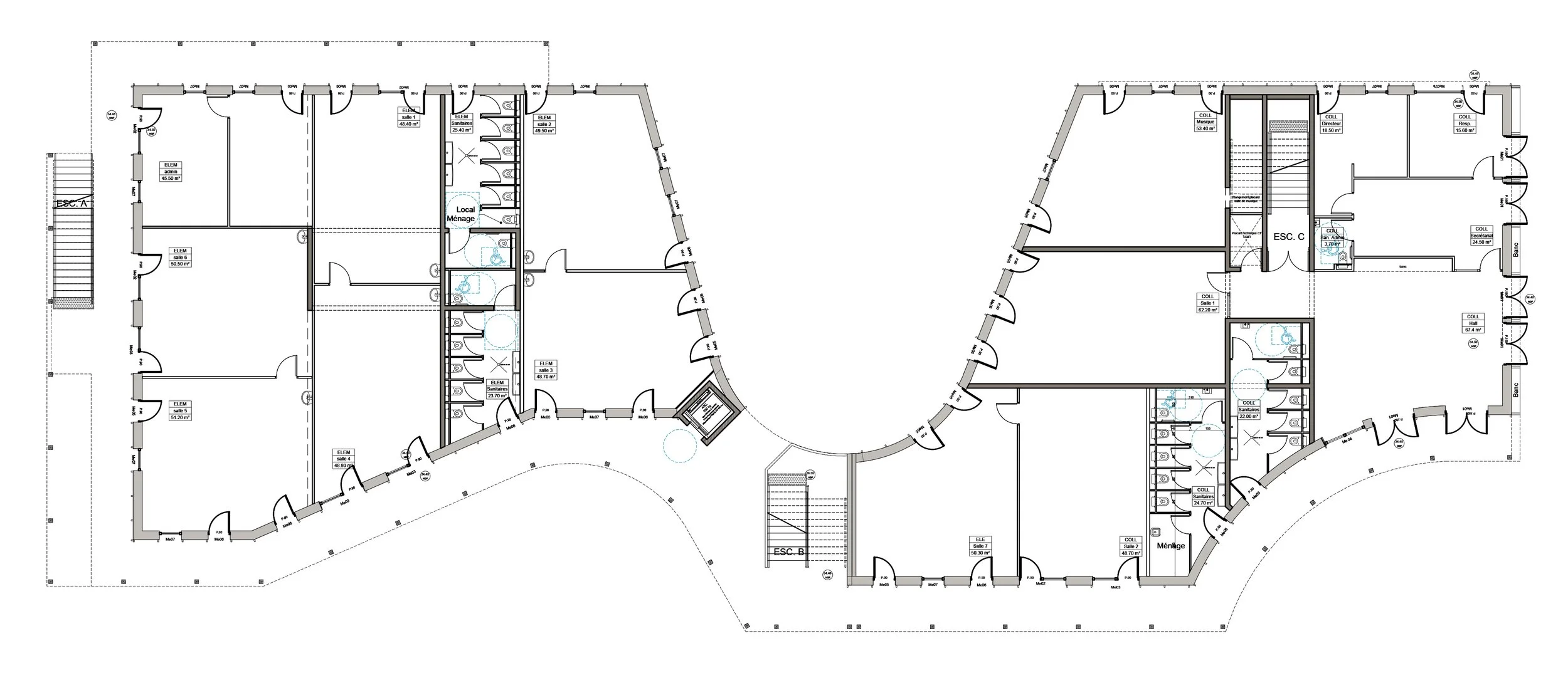 Une écriture architecturale contemporaine assumée et intégrée par les courbes qui scandent les façades, ainsi que par les coursives protectrices mettant en scène les circulations à l’intérieur du bâtiment et prolongeant les classes sur l’extérieur.