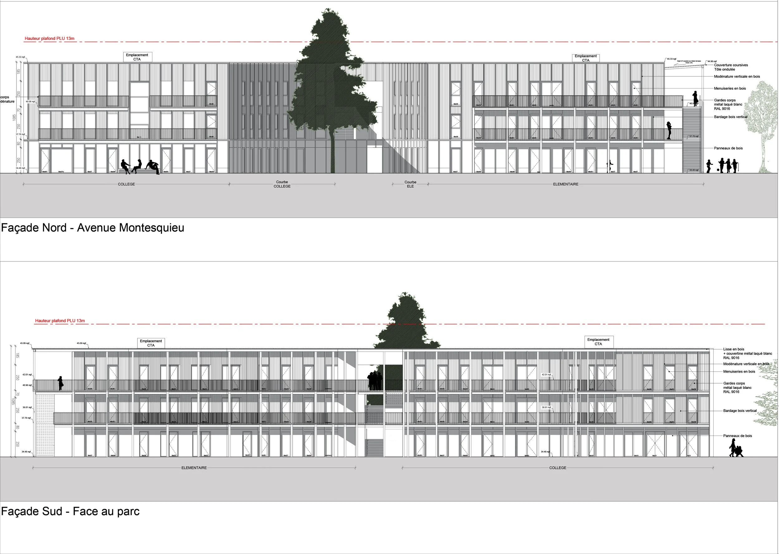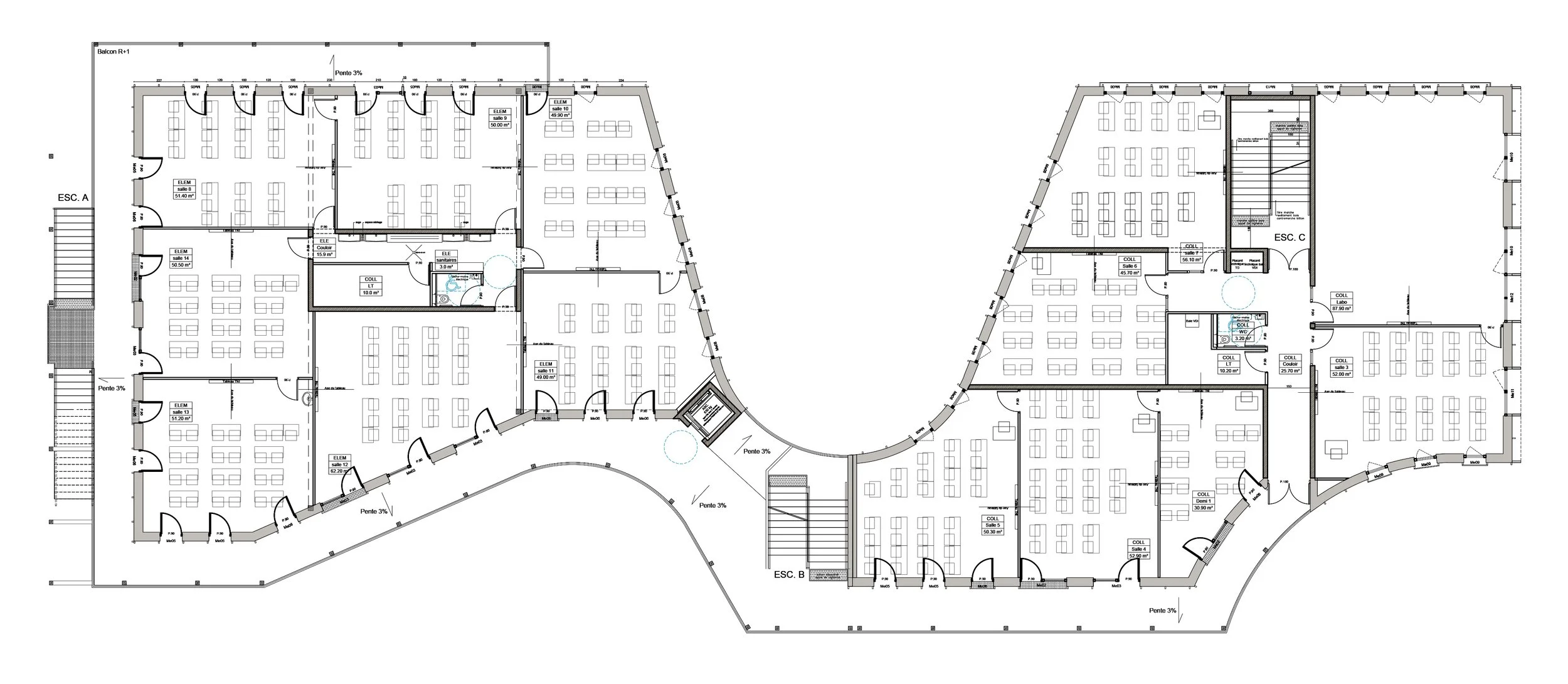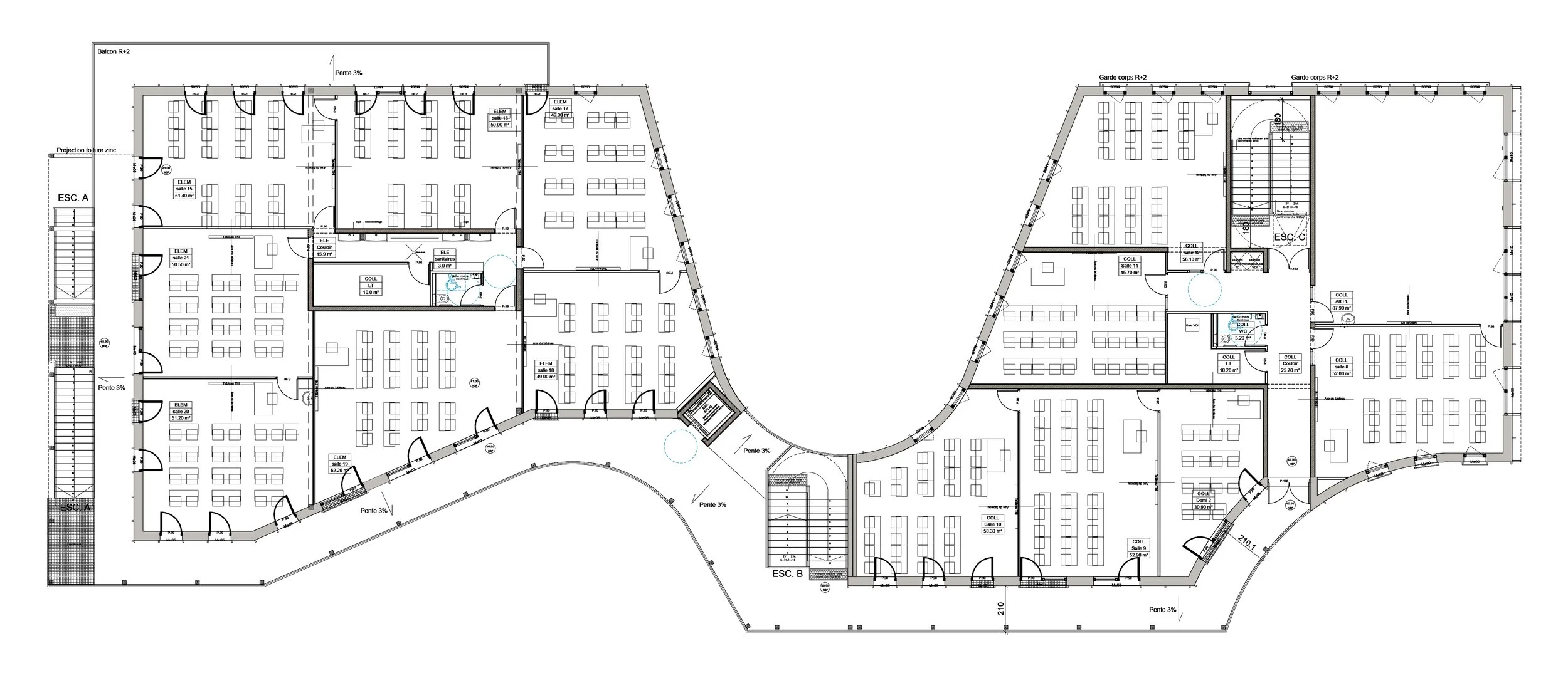 Une géométrie réglée, qui se déploie en courbes au sein des frondaisons arborées, afin d’héberger sa fonction première : accueillir des espaces d’enseignement pour des élèves de 6 à 15 ans.