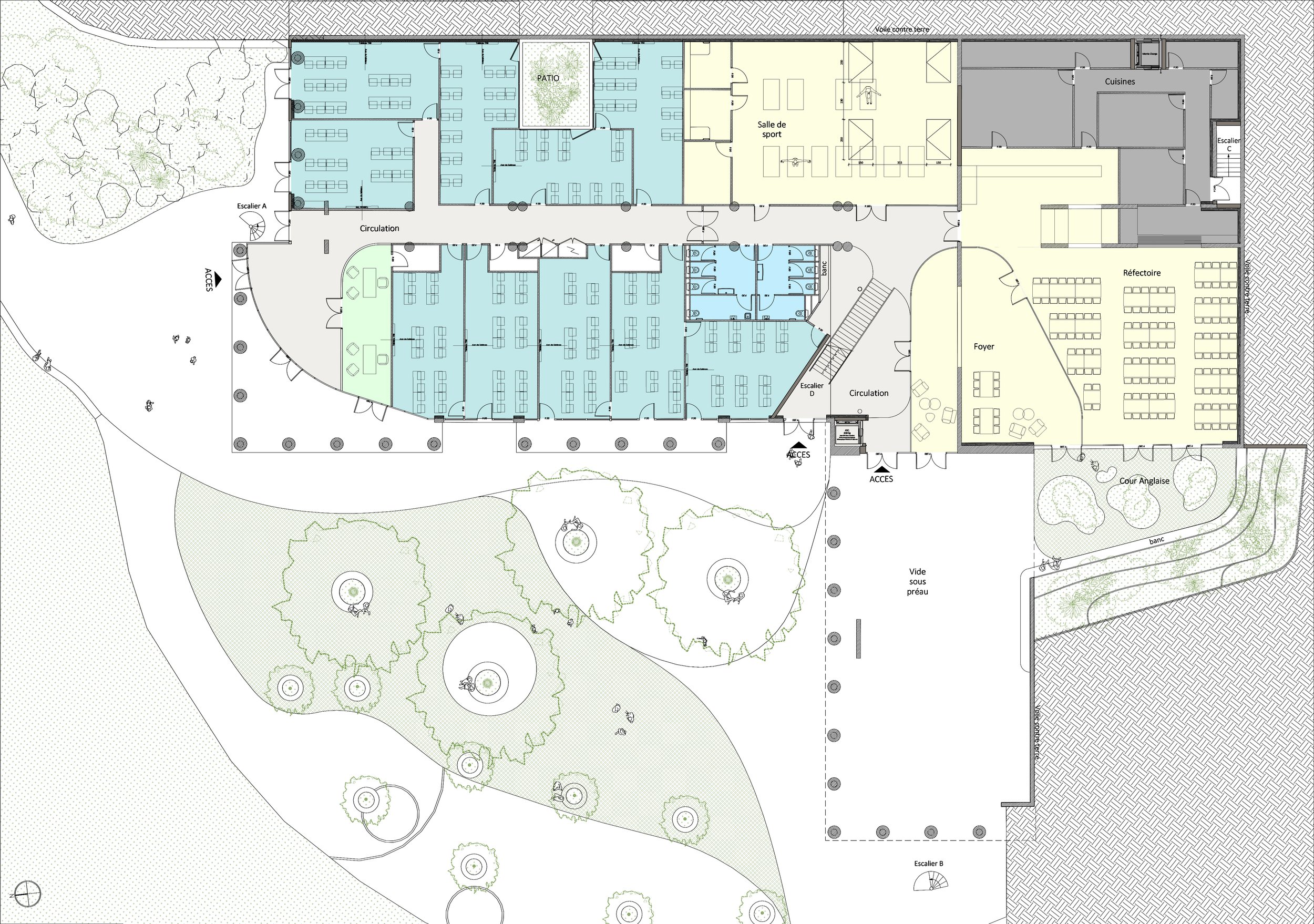 Le projet consiste à aménager le rez-de-jardin (RDJ) du bâtiment existant sur pilotis. Cet aménagement entraine une reconfiguration du rez-de-chaussée (RDC) et forme un seul ERP. Ainsi l’opération a pour objet le reclassement de l’ensemble du bâtiment (RDC+RDJ) en type R de 3ème catégorie avec activité de type X et N.
